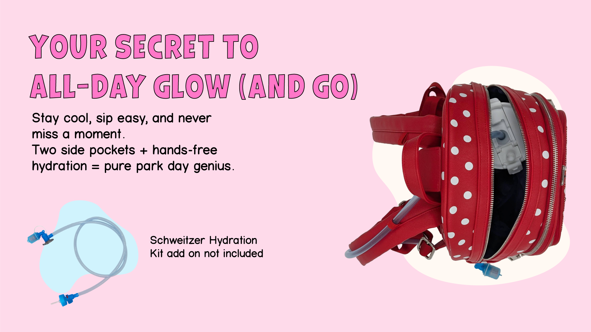 I took this bag on a four-day trip to Disneyland and it was everything I needed and wanted! The water system was so great and easy to use (I practiced with it on a hike before my trip). It never leaked and didn't make the bag feel too heavy at all. I had enough space for the water bottle, sunscreen, hat, hand sanitizer, wipes, long-sleeve shirt, phone charging battery with cord, snacks, and sundries. I would say I used it pretty equally between the backpack and shoulder strap modes. I didn't end up actually using it cross-body style because I wanted to keep the straps at the length I had adjusted them to for the backpack mode. I loved putting all my Disney pins on the front pocket for that extra flair! Highly highly recommend this bag.