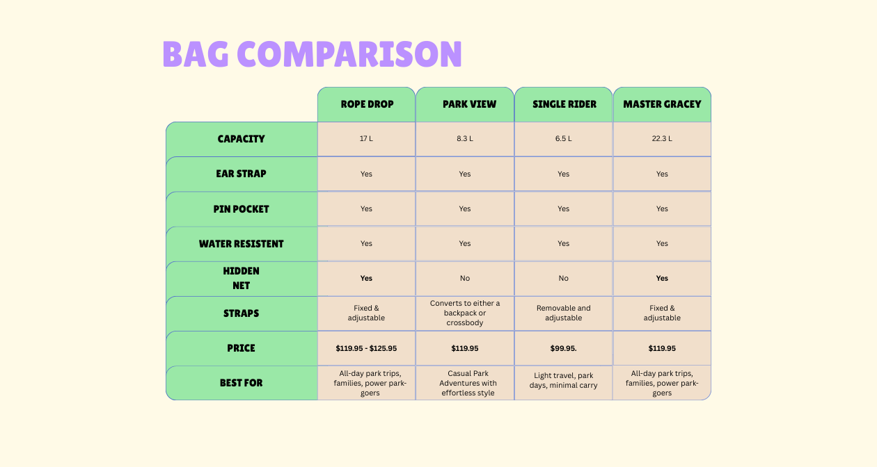When this park-loving mama couldn’t find the perfect bag, I created it! The Rope Drop became our first best-seller and has inspired every bag since. We’re all about blending style with smart design to make your park days(and every adventure) even more magical!